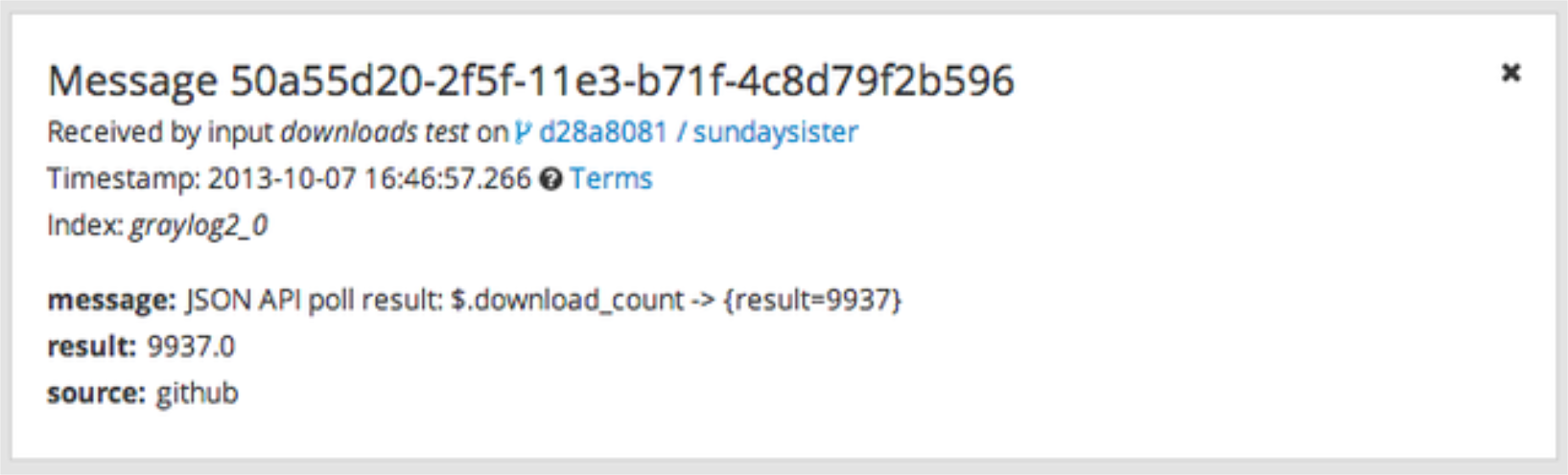 The JSON path value from HTTP API input reads any JSON response of a REST resource and stores a field value as a Graylog message.