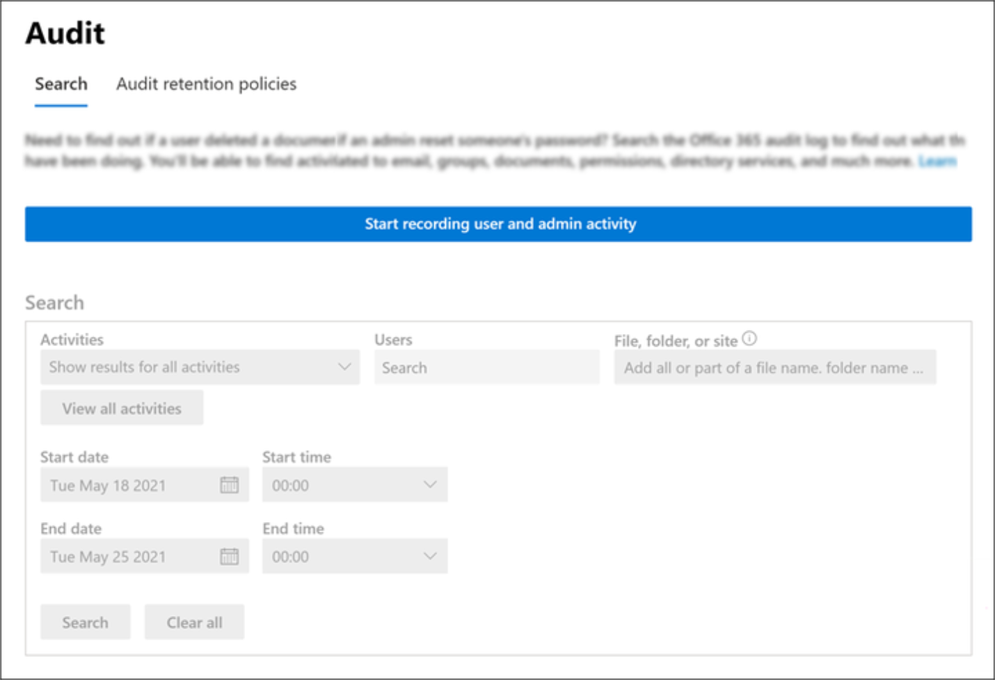Navigate to the Audit Log Search page in Microsoft Purview and click the Start recording user and admin activity button to enable audit logging. Up to 24 hours may be needed for logs to enter Graylog the first time Unified Audit Log is enabled. We strongly recommend waiting 24 hours before proceeding with O365 Input setup in Graylog to ensure your subscription in Azure is properly set up for audit logging. If there is no blue button stating Start recording user and admin activity, then audit logging is already enabled, and you can proceed with the remainder of input configuration.