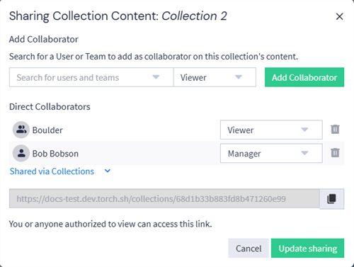 For the steps to share collection content, see Share Collection Content above. The sections below describe how to update details of the collection itself and change existing sharing options.