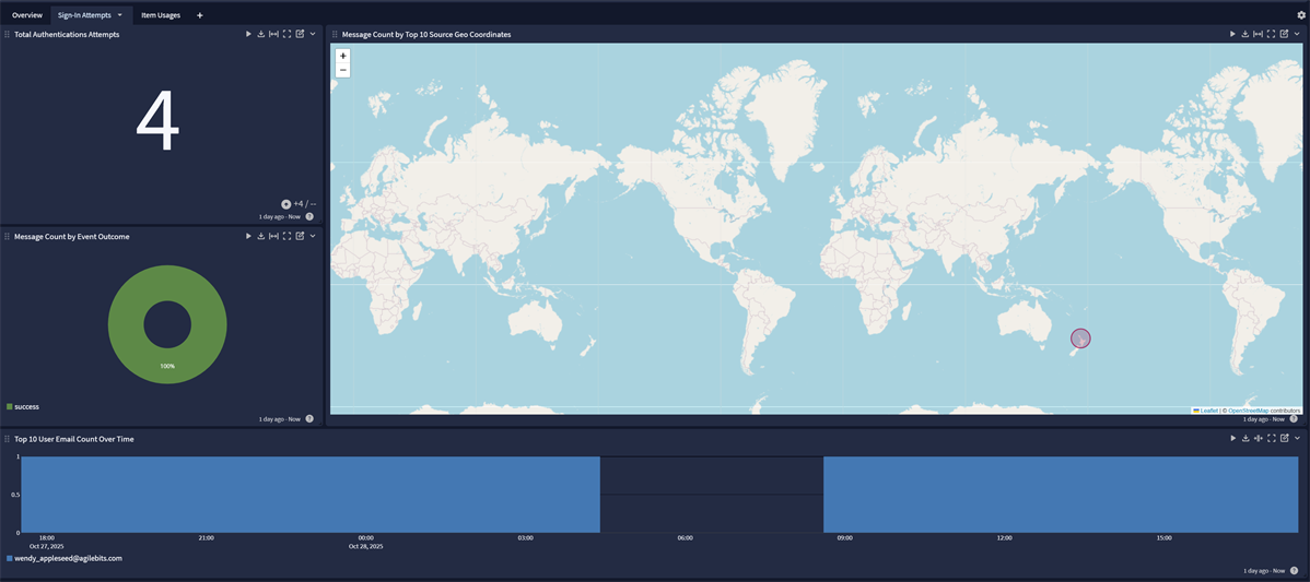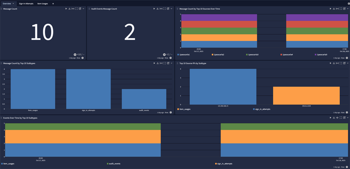 A spotlight providing overview dashboards for 1Password events