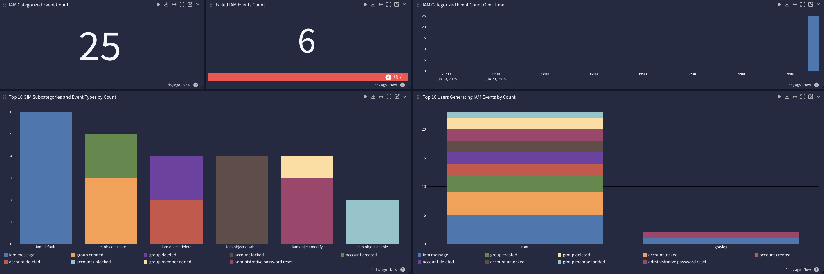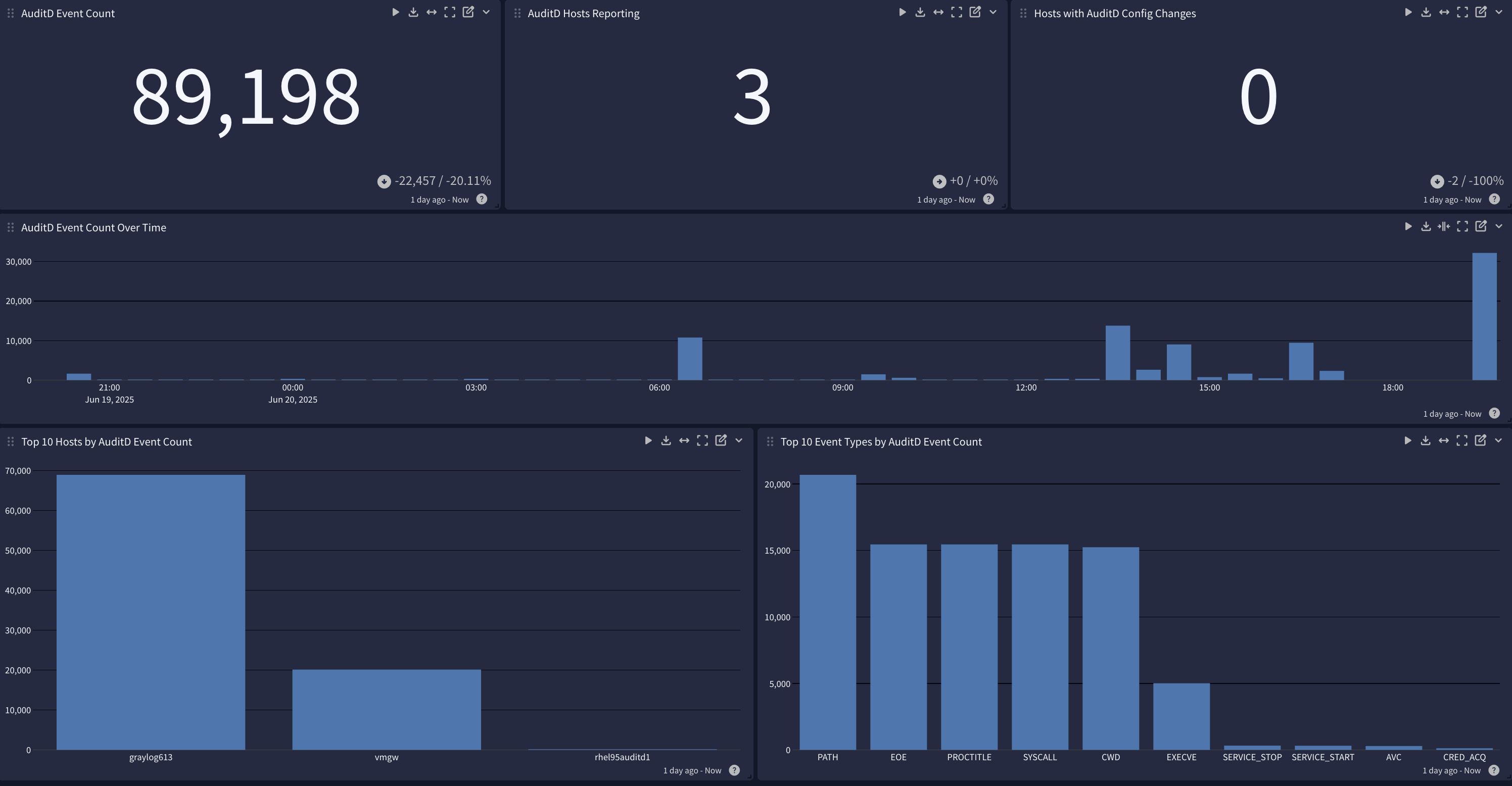 An AuditD Overview dashboard that delivers an at-a-glance summary of key security events and the status of AuditD logging activity.