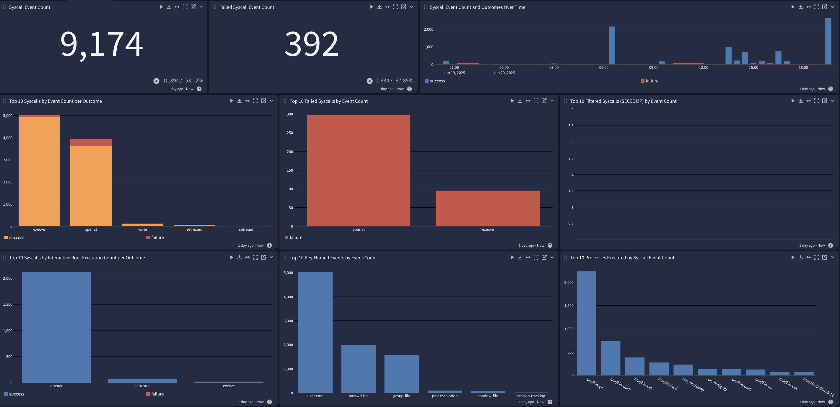SYSCALL events are generated when system calls are invoked by user-space processes. These logs provide detailed insight into process behavior, arguments passed to syscalls, and user context at execution time. Monitoring these events enables deep visibility into potential privilege escalations, file modifications, or anomalous process behavior.