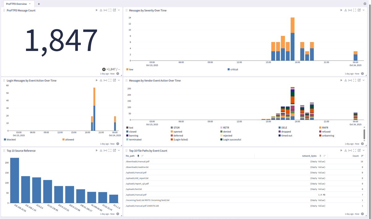 The ProFTPD Server content pack is designed to extract, normalize, and enrich ProFTPD event data for more effective analysis and monitoring. It parses default logs and enhanced logs into structured fields and adds useful context like event categorization (e.g. authentication and file events). This parsing and normalization enables faster search, correlation, and dashboard creation across diverse environments.